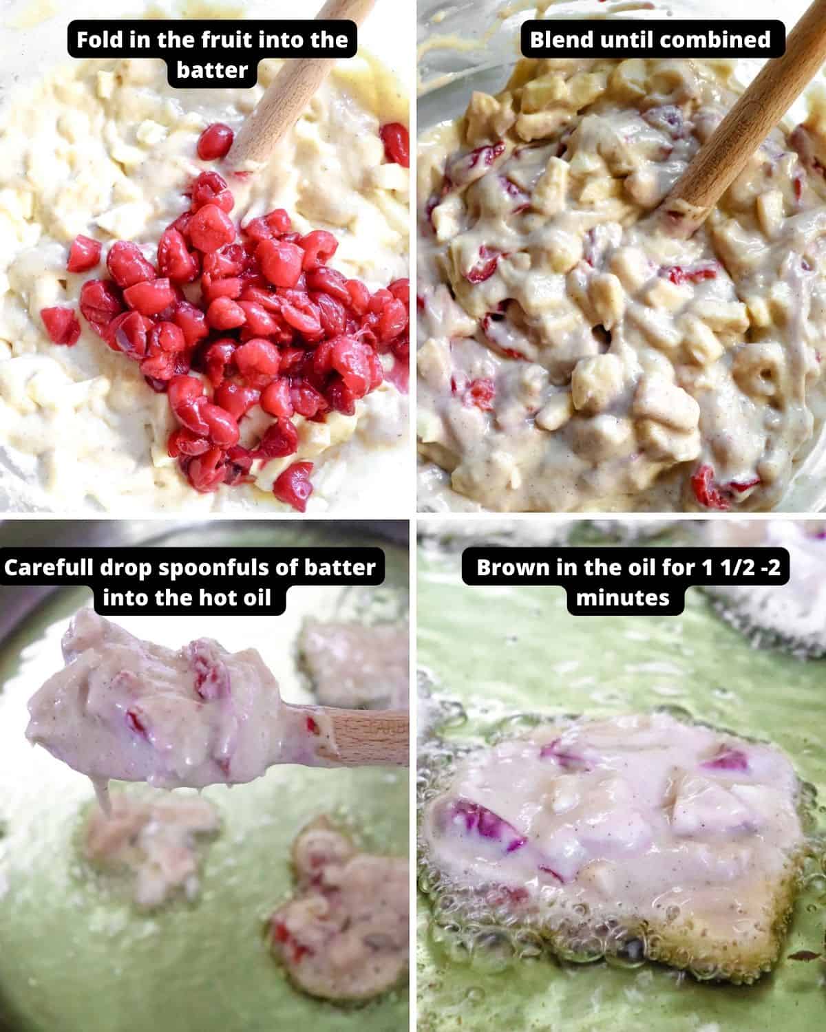 - Add diced apples and chopped cherries to the fritter batter mixture. Set aside.